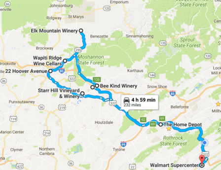 Starting from the Lewistown Walmart, and also picking up at the State College Home Depot, we'll visit 5 Clearfield and Elk county wineries. We'll spend an hour at each location tasting and purchasing fine wines. We'll also enjoy a guided tour of one of the wineries. Space is extremely limited, so don't delay!